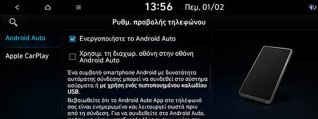 Σε αυτό το μενού, ο χρήστης μπορεί να ενεργοποιήσει το Android Auto και το Apple CarPlay επιλέγοντάς τα.