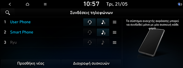 Εμφανίζει τη λίστα των αντιστοιχισμένων συσκευών Bluetooth. Όταν επιλέγετε από τη λίστα, η συσκευή συνδέεται ή αποσυνδέεται.