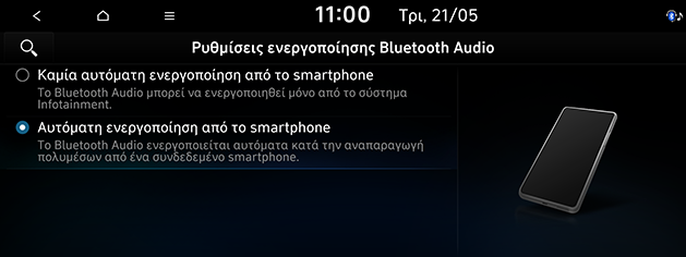 Μπορείτε να ρυθμίσετε τη λειτουργία ήχου Bluetooth ώστε να ενεργοποιείται αυτόματα όταν το συνδεδεμένο τηλέφωνο αναπαράγει ήχο. Ακόμη και όταν η άλλη λειτουργία είναι ενεργοποιημένη ή όλες οι λειτουργίες πολυμέσων είναι απενεργοποιημένες, εάν αναπαράγετε ήχο Bluetooth στο τηλέφωνό σας, η λειτουργία πολυμέσων αλλάζει αυτόματα σε λειτουργία ήχου Bluetooth, ώστε να μπορείτε να ελέγχετε την αναπαραγωγή στο τηλέφωνο. Βεβαιωθείτε ότι το τηλέφωνό σας είναι αντιστοιχισμένο και συνδεδεμένο στο σύστημα infotainment πριν από τη ρύθμιση.