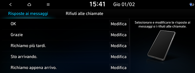È possibile selezionare il messaggio desiderato in Risposte ai messaggi o Rifiuti alle chiamate.