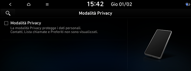 È possibile impostare la modalità privacy per proteggere i propri dati personali. Quando è attiva la modalità privacy, i contatti la cronologia delle chiamate, i preferiti e i messaggi non vengono visualizzati.