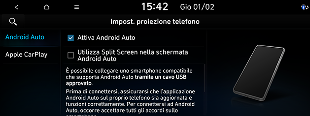 Attiva Android Auto/Attiva Apple CarPlay: Abilita la proiezione del telefono. Tramite questo sistema è possibile controllare la proiezione del telefono.