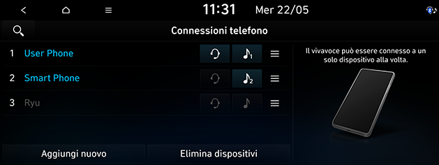 Visualizza l'elenco dei dispositivi Bluetooth accoppiati. È possibile collegare o scollegare un dispositivo dopo averlo selezionato da un elenco.