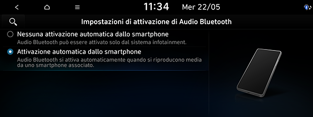 È possibile impostare la modalità audio Bluetooth in modo che si attivi automaticamente quando il telefono collegato riproduce l'audio. Anche quando è attivata l'altra modalità o tutte le modalità multimediali sono disattivate, se si riproduce l'audio Bluetooth sul telefono, la modalità multimediale viene commutata automaticamente in modalità audio Bluetooth in modo da poter controllare la riproduzione sul telefono. Verificare che il telefono sia accoppiato e collegato al sistema di infotainment, prima di impostarlo.