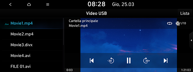 ] > Fonti multimediali > Video USB o passare attraverso il pulsante MODE sul volante. -