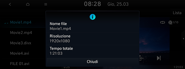 Questa funzione mostra le informazioni sul nome, la risoluzione e la riproduzione del file.