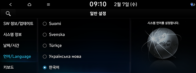 이 메뉴는 시스템의 언어를 설정하기 위해 사용됩니다.