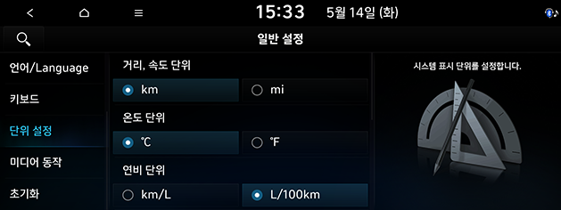이 메뉴는 시스템에서 사용되는 단위를 구성하는 데 사용합니다.