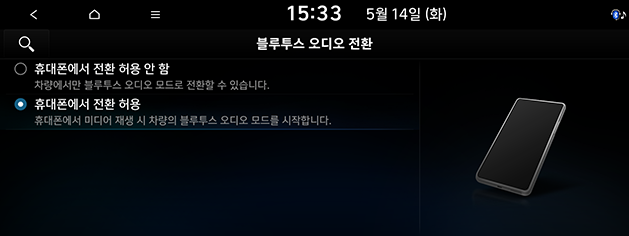 휴대폰에서 전환 허용: 연결된 휴대폰에서 블루투스 오디오를 제어하는 경우, 블루투스 오디오 모드가 자동으로 활성화되어 사용자가 휴대폰의 오디오 재생을 제어할 수 있습니다.