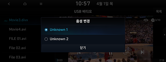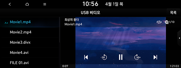 ] > 미디어 선택 > USB 비디오를 누르거나 운전대의 MODE 버튼을 토글하세요. -