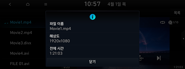 파일의 이름, 해상도 및 재생 시간 정보를 표시합니다.
