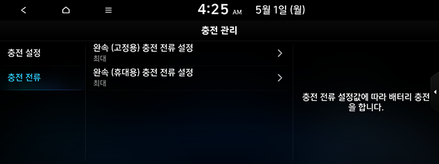 PHEV > 충전 관리 > 완속 충전 전류를 누르세요.