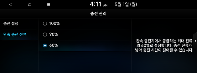 AC 충전기로 공급할 전류를 60%, 90% 또는 100%로 설정할 수 있습니다.