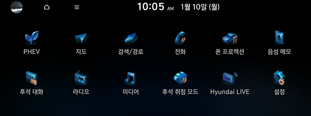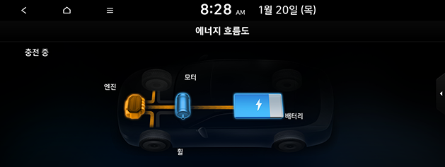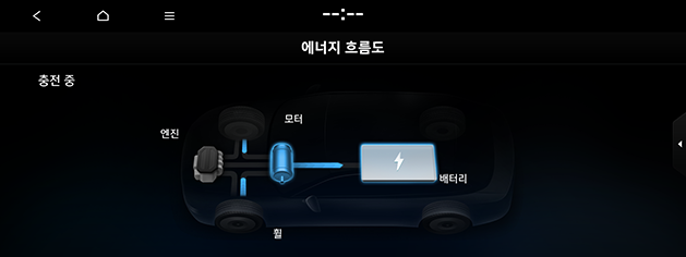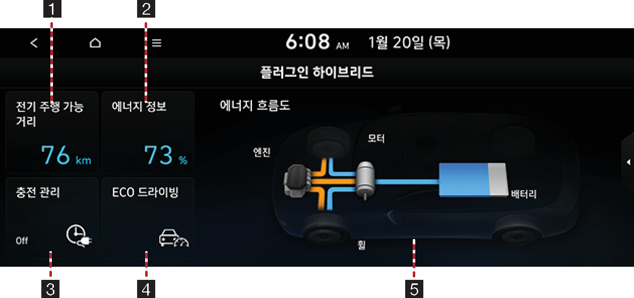 플러그인 하이브리드 메뉴는 전기 주행 가능 거리, 에너지 정보, 충전 관리, ECO 드라이빙, 에너지 흐름도 등의 세부 메뉴로 구성되어 있습니다.