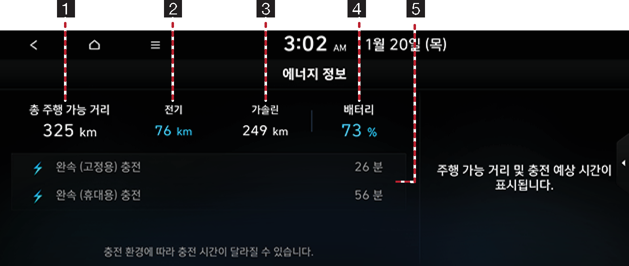 현재 연료와 배터리로 주행 가능한 거리를 표시합니다.