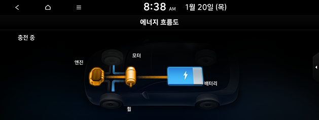 차량이 정차 대기에 있는 동안, 엔진 동력이 배터리 충전에 사용됩니다.