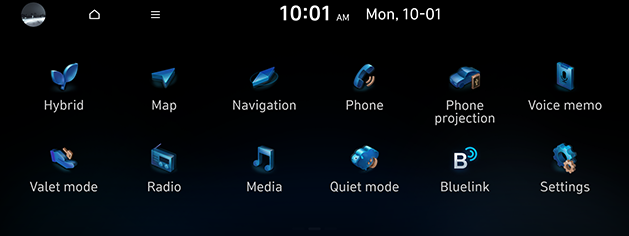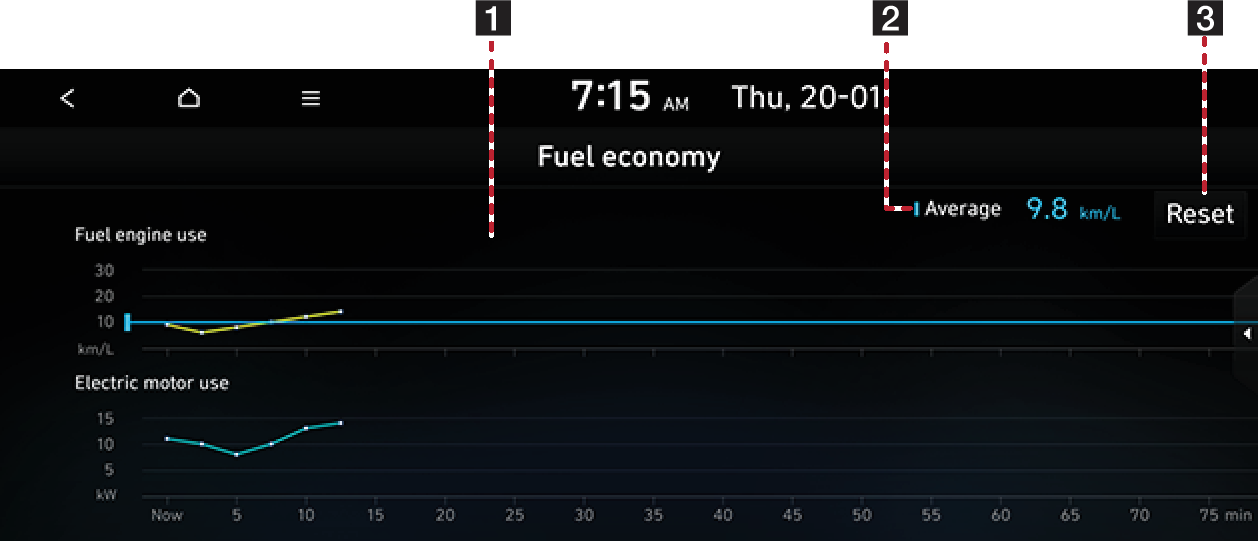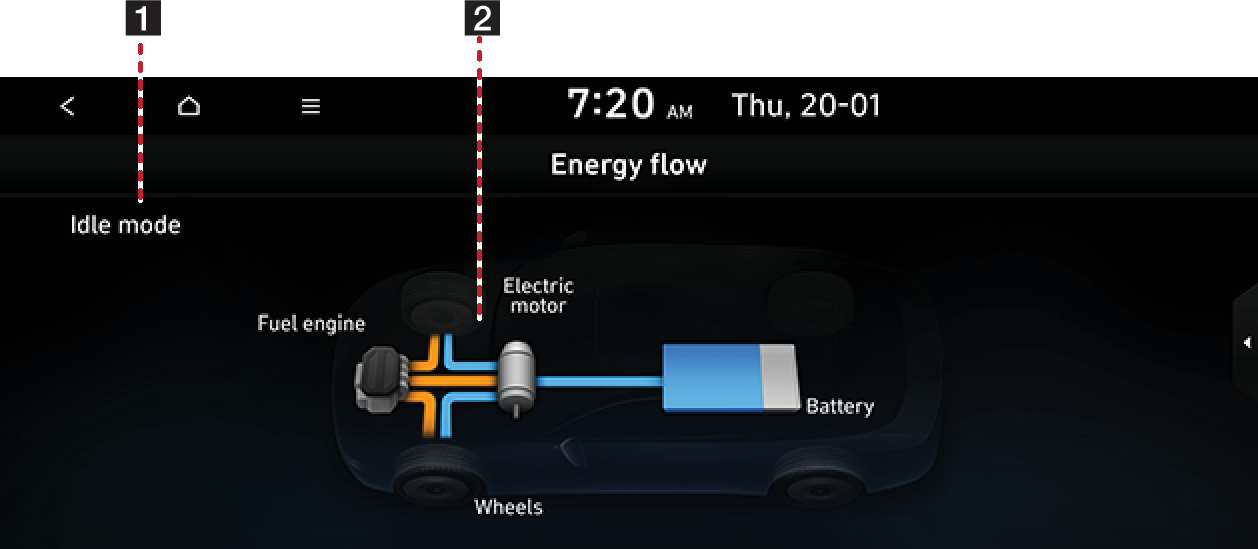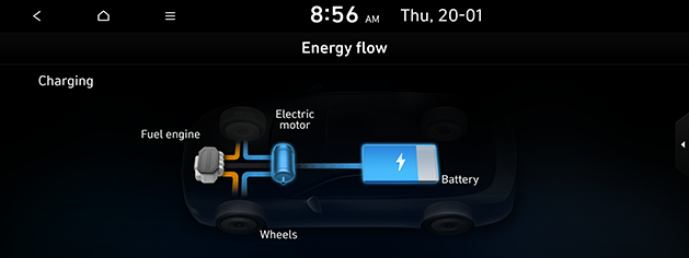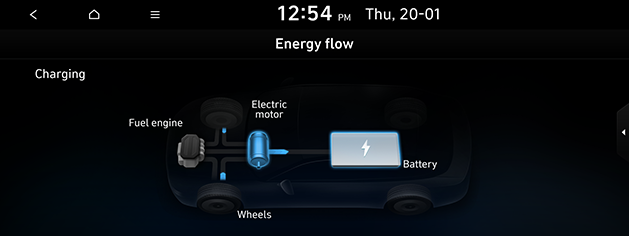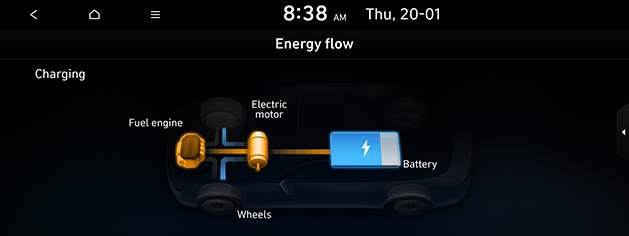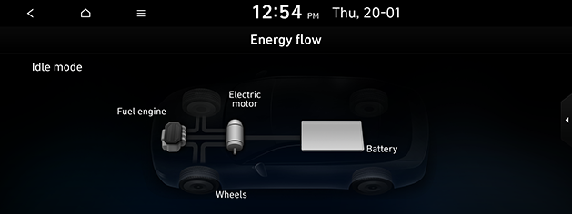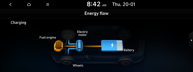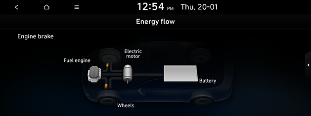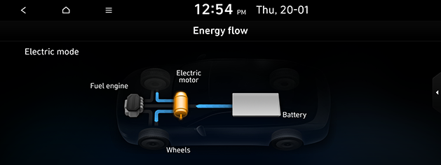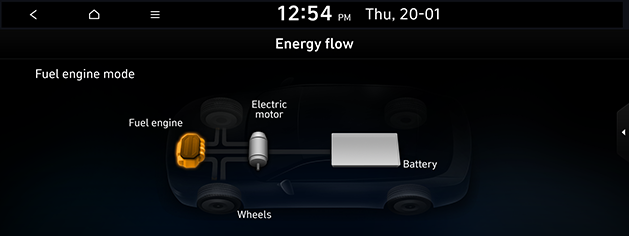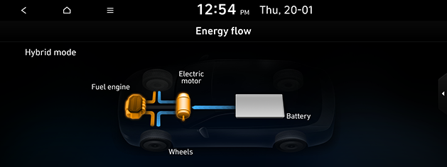 Den Hybridmenü besteet aus zwou Sektiounen: Fuel economy, Energy flow.