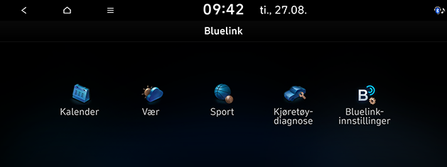 Bruk Bluelink-funksjoner som Kalender, Vær, Sport, Diagnostikk av kjøretøy og innstillinger for Bluelink. Bluelink-funksjoner kan brukes etter aktivering av tjenesten. En egen avgift kan belastes for bruk av Bluelink, og funksjonene kan variere ifølge din tjenesteplan.