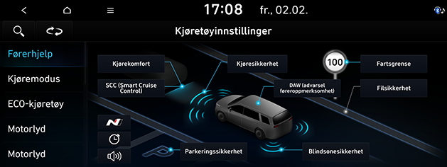 Trykk på SETUP > Kjøretøy > Fører-assistanse.