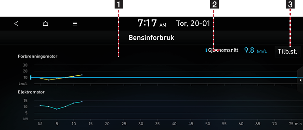 Viser informasjon om drivstofføkonomi. (Grafen oppdateres hvert 2. minutt og 30 sekunder.)