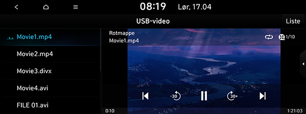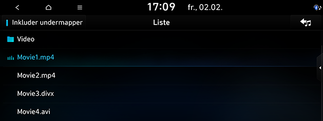 • For å spille av USB-video mens en annen kilde spilles av, trykk på [] > Mediakilder > USB-video eller bytt via MODE-knappen på rattet.