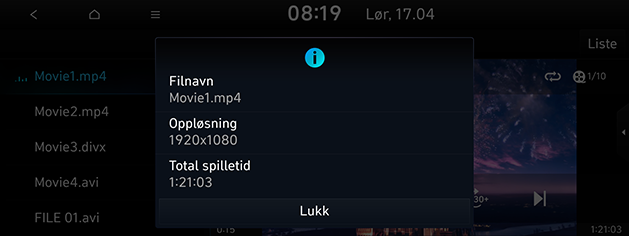 Denne funksjonen viser informasjon om navn, oppløsning og avspillingstid for filen.