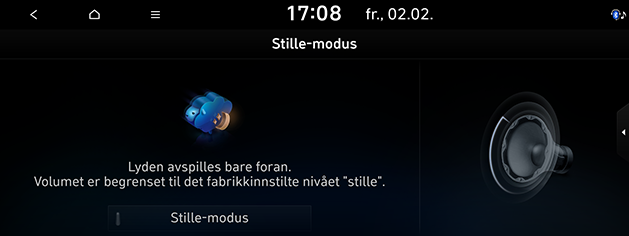 Radio og media spilles kun i forsetet i denne modusen. For å slå på stille modus trykk på Stille-modus. Trykk igjen for å slå av.