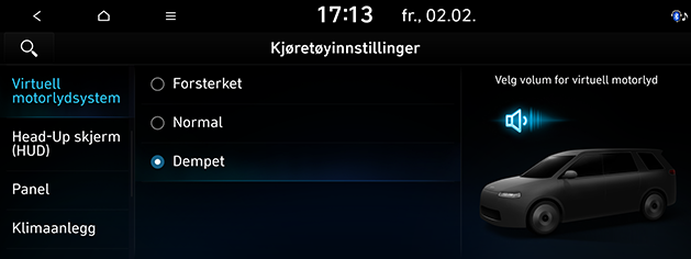 Trykk på SETUP > Kjøretøy > Virtuell motorlydsystem.