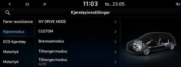 Du kan endre innstillingene for kjøremodus. Den vises som Kjøre-/terrengmodus på noen kjøretøy. Noen funksjoner og bilder kan avvike fra det aktuelle produktet, i henhold til modell, alternativ og land.