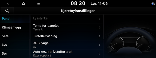 Lysstyrke: Stiller inn lysstyrken for instrumentpanelet.