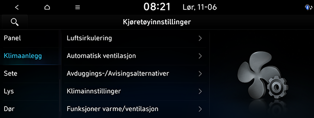 Trykk på SETUP > Kjøretøy > Klimaanlegg.