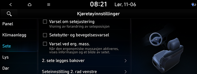 Komfort setetilgang (opp/ned): Innstiller setet til å beveges automatisk når føreren setter seg inn i kjøretøyet eller forlater kjøretøyet.