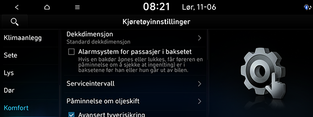 Komfort setetilgang: Velger setets bevegelsesavstand når føreren setter seg inn i kjøretøyet eller forlater kjøretøyet. Du kan velge Maksimal, Normal eller Av.