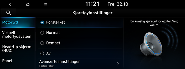 Velg de ønskede elementene. Du kan stille inn motorlydmodus til Forsterket, Normal, Dempet eller Av.