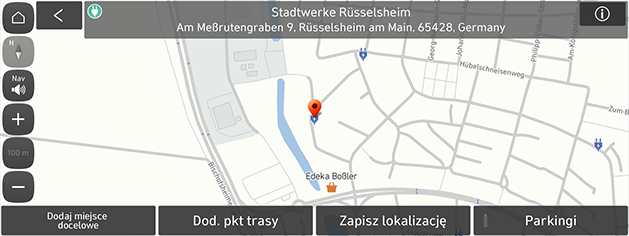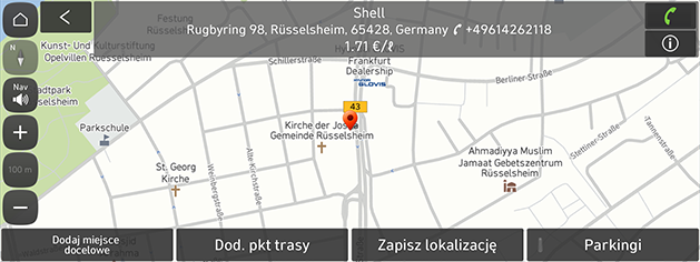 Dod. pkt trasy: Dodaje tę lokalizację jako punkt wycieczki do bieżącej trasy. Dostępne tylko wtedy, gdy został ustawiony cel podróży.