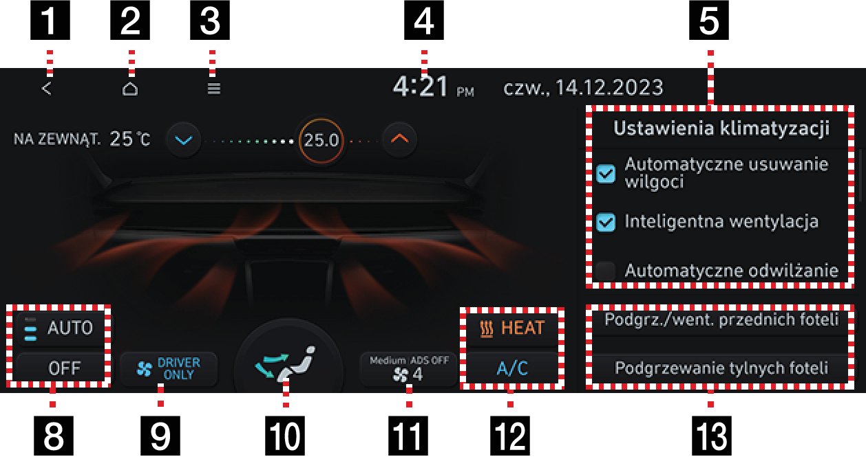 Przechodzi do ekranu ustawień opcji ogrzewania/wentylacji.