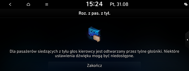 Przedni mikrofon wychwytuje głos kierowcy i odtwarza go przez tylne głośniki. Naciśnij przycisk Roz. z pas. z tył. na ekranie głównym. Aby wyłączyć, naciśnij Zakończ.