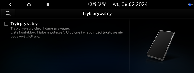 Możesz ustawić tryb prywatności, aby chronić swoje dane osobowe. W przypadku włączenia tryby prywatności nie są wyświetlane kontakty, historia połączeń, ulubione i wiadomości.