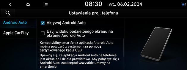Ustaw opcje projekcji telefonu na Android Auto lub Apple CarPlay.