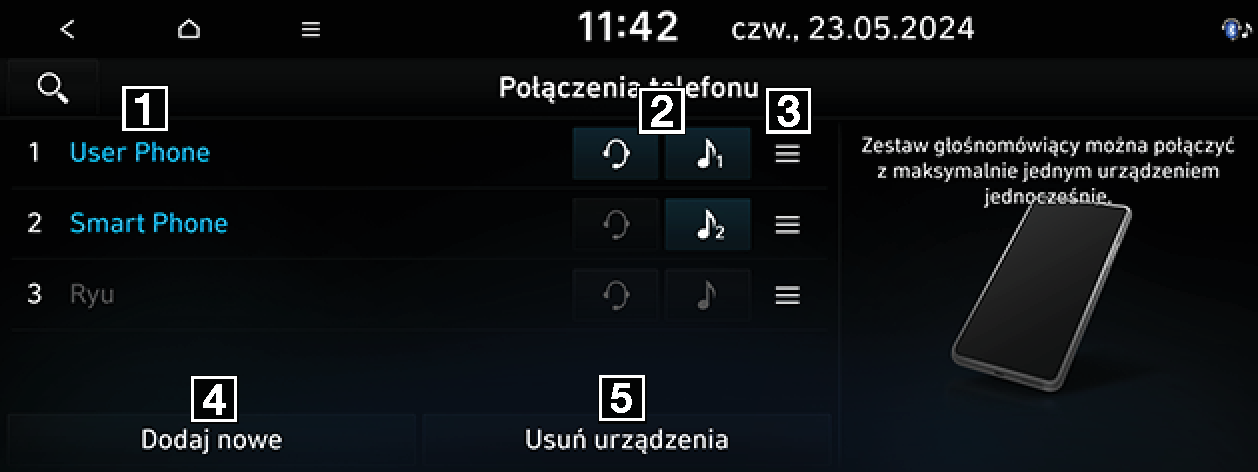 Wyświetla listę sparowanych urządzeń Bluetooth. Wybranie urządzenia z listy powoduje jego podłączenie lub odłączenie.