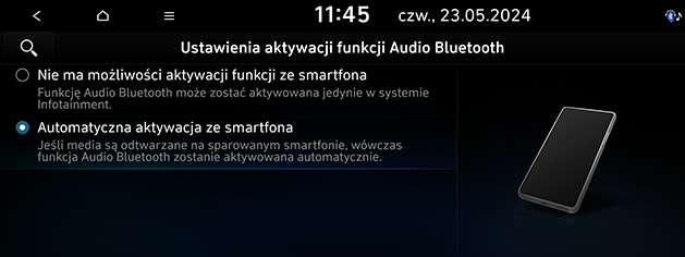 Można ustawić tryb audio Bluetooth na automatycznie aktywowany, gdy podłączony telefon odtwarza dźwięk. Nawet jeśli aktywny jest inny tryb lub wszystkie tryby multimedialne są wyłączone, jeśli odtwarzasz dźwięk Bluetooth w telefonie, tryb multimedialny jest automatycznie przełączany na tryb audio Bluetooth, dzięki czemu można kontrolować odtwarzanie w telefonie. Przed ustawieniem sprawdź, czy telefon jest sparowany i podłączony do systemu informacyjno-rozrywkowego.