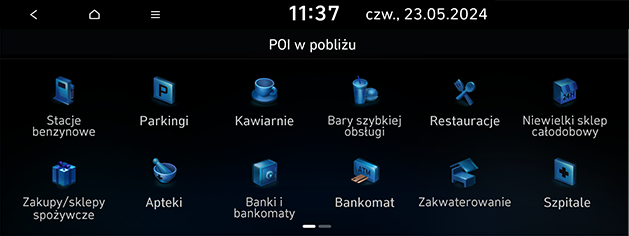 Punkt docelowy: Wyszukuje punkty POI w pobliżu bieżącego miejsca docelowego. Dostępne tylko wtedy, gdy został ustawiony cel podróży.