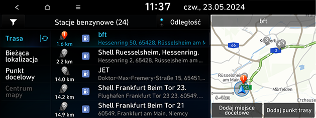Punkt docelowy: Wyszukuje stacje benzynowe w pobliżu wybranego miejsca docelowego.