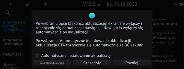 Przeprowadź aktualizację, gdy pojazd nie jest używany przez ponad 15 minut. Czas potrzebny na aktualizację systemu różni się w zależności od sytuacji.