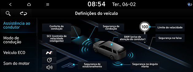 Segurança de condução (se equipado): ajusta as propriedades do sistema de segurança em condução.