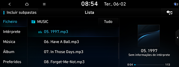 A categoria pode ser organizada por Ficheiro, Intérprete, Música, Álbum ou Preferidos.