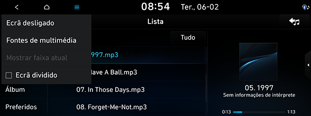] > Música deste artista ou Título deste álbum para mover o ecrã do menu de listas. -