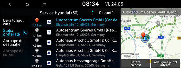 De-a lungul rutei: Caută service-uri Hyundai pe ruta curentă. Disponibil doar dacă destinația este setată.