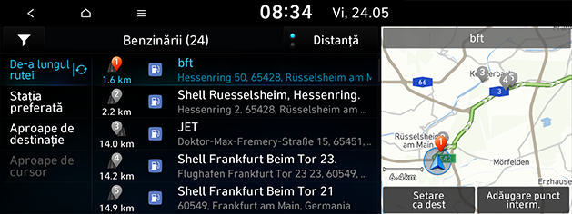 De-a lungul rutei: Caută POI-uri pe ruta curentă. Disponibil doar dacă destinația este setată.
