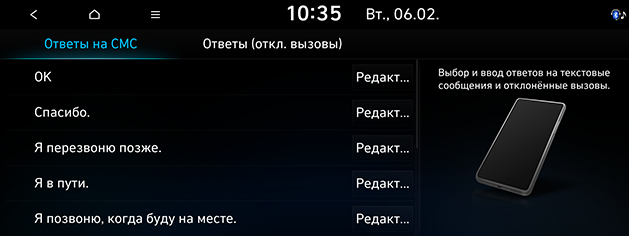 Необходимое сообщение можно выбрать в меню Ответы на СМС или Ответы (откл. вызовы).